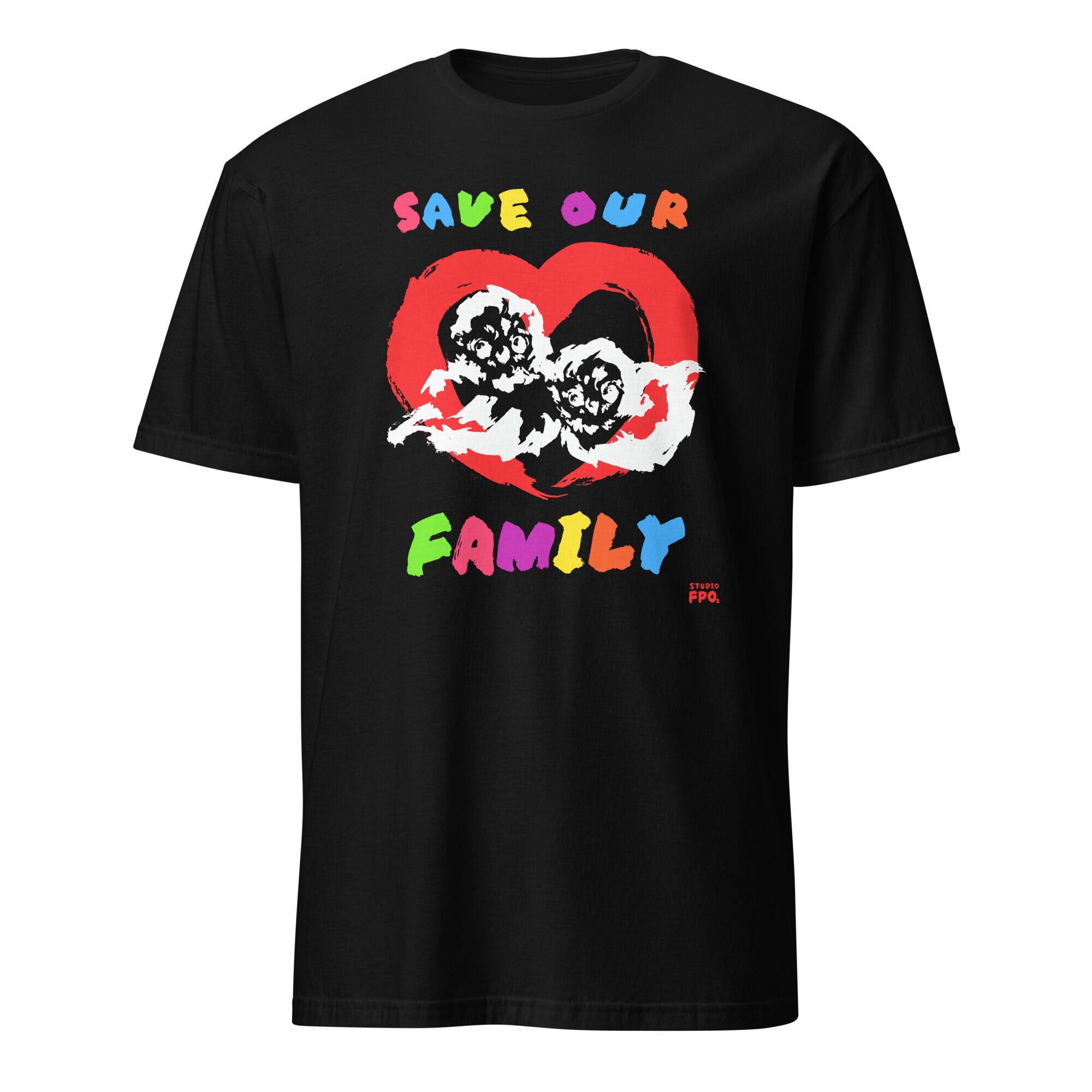 愛らしく寄り添ったふくろうが描かれた半袖Tシャツです。メッセージには「大切な家族」との思いが込められています。